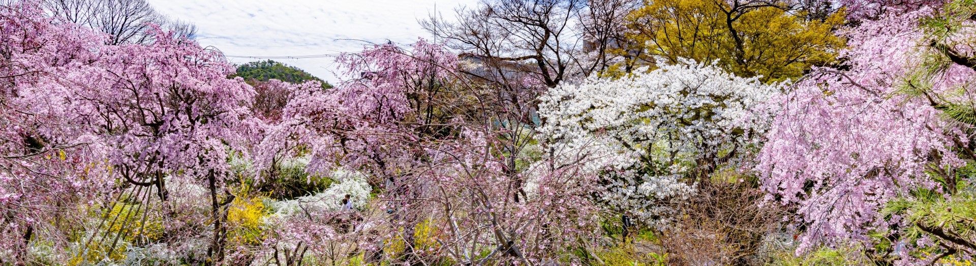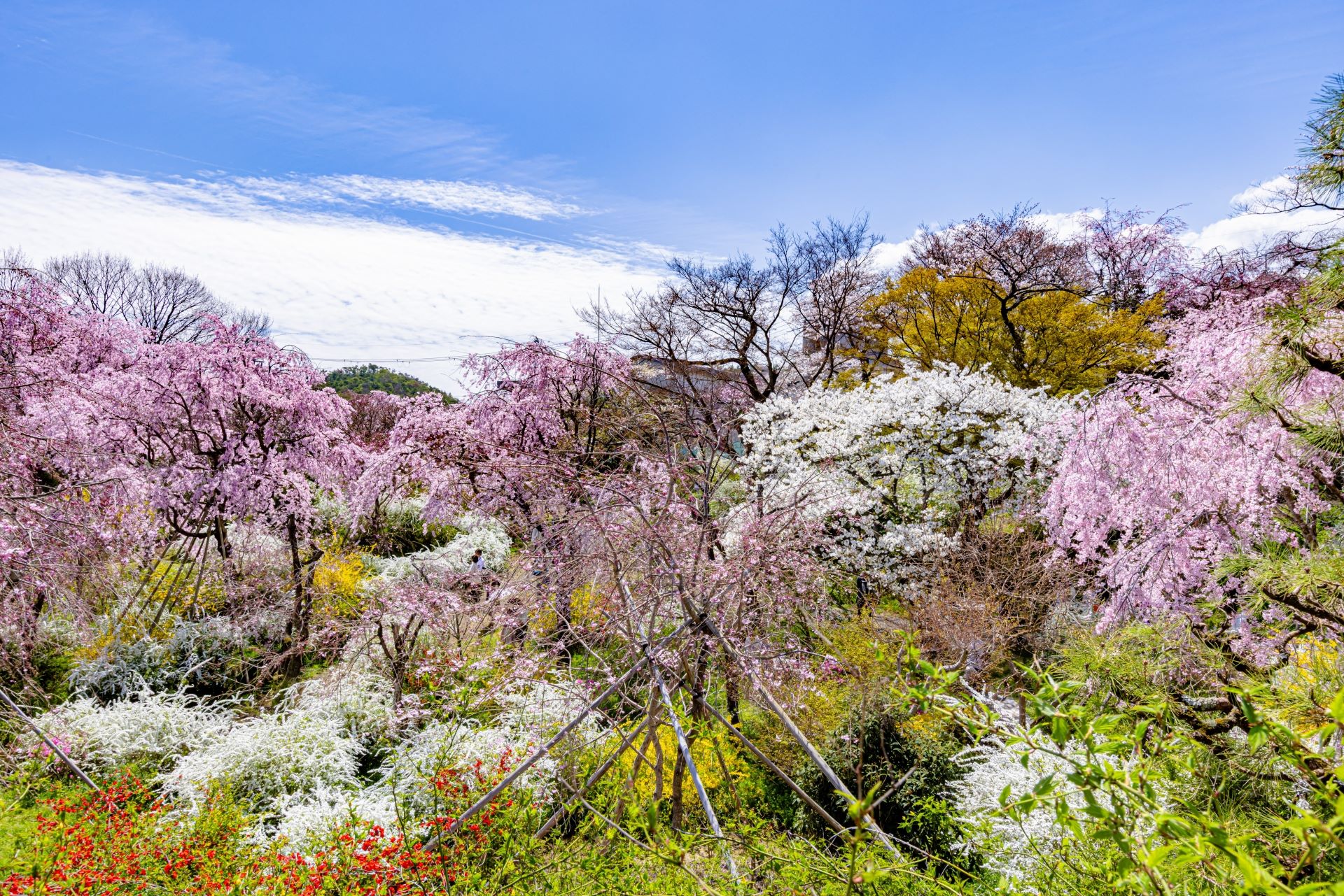 原谷苑(およそ4000坪の敷地にベニシダレザクラやヨシノザクラなど約20種、400本の桜がユキヤナギやヤマブキ、山ツツジとともに咲き乱れる様は絶景)